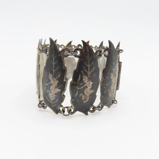 Vintage Siam Sterling Silver 925 Niello Dancer Leaf Panel Bracelet 6-1/2" 32.3g