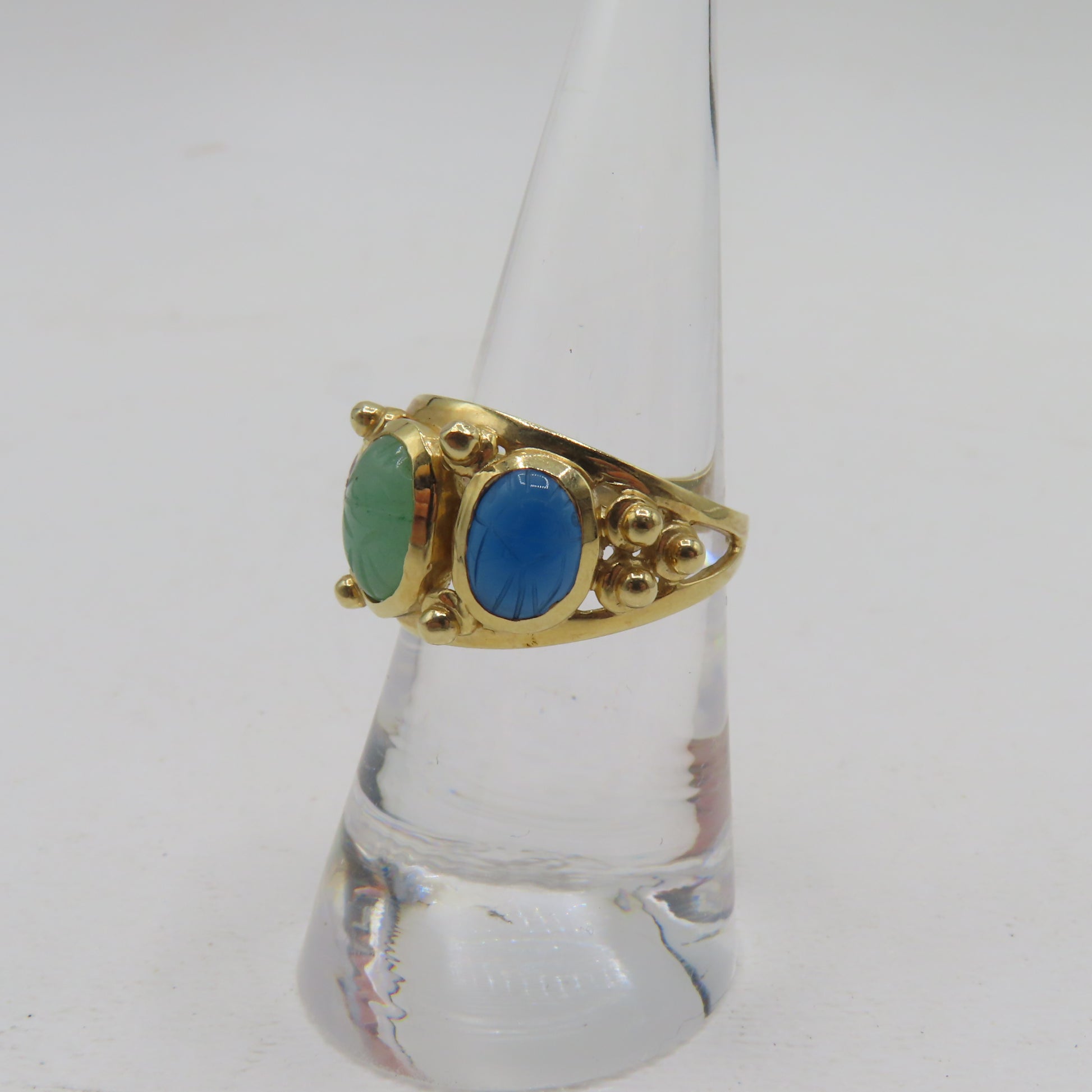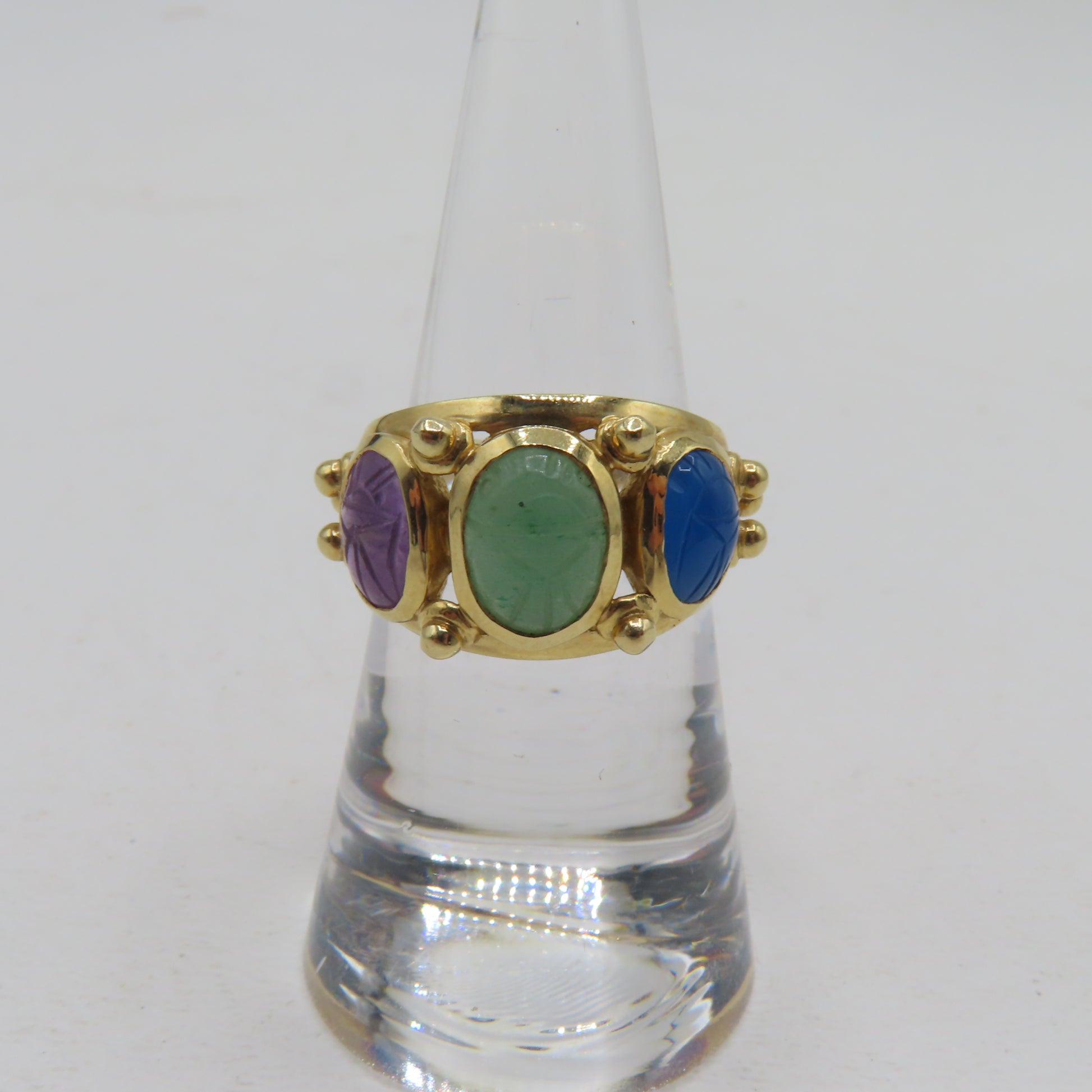 This striking ring is crafted in solid 14K yellow gold and set with three colorful carved scarab gemstones, each symbolizing protection and rebirth in ancient tradition. The scarabs are beautifully detailed and bezel set, with bold gold accents framing the vibrant stones.