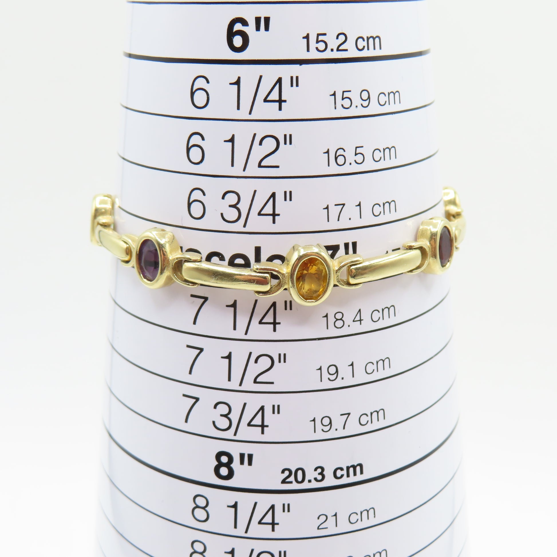 Add vibrant elegance to your collection with this 14K Yellow Gold Multicolor Oval Gemstone Bar Link Bracelet. This striking design features oval-shaped gemstones in a variety of rich colors, each beautifully set and separated by polished 14K yellow gold bar links. The alternating pattern creates a refined, balanced look that shines from every angle. Measuring 8.9mm wide and 7 inches long, this bracelet weighs 15.5 grams, offering a substantial and luxurious feel on the wrist.